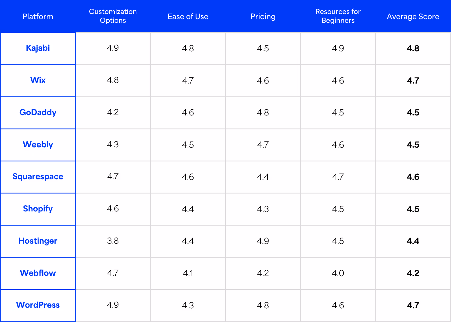 Here's a comparative table of the website builders discussed and evaluated across different features to help you decide: