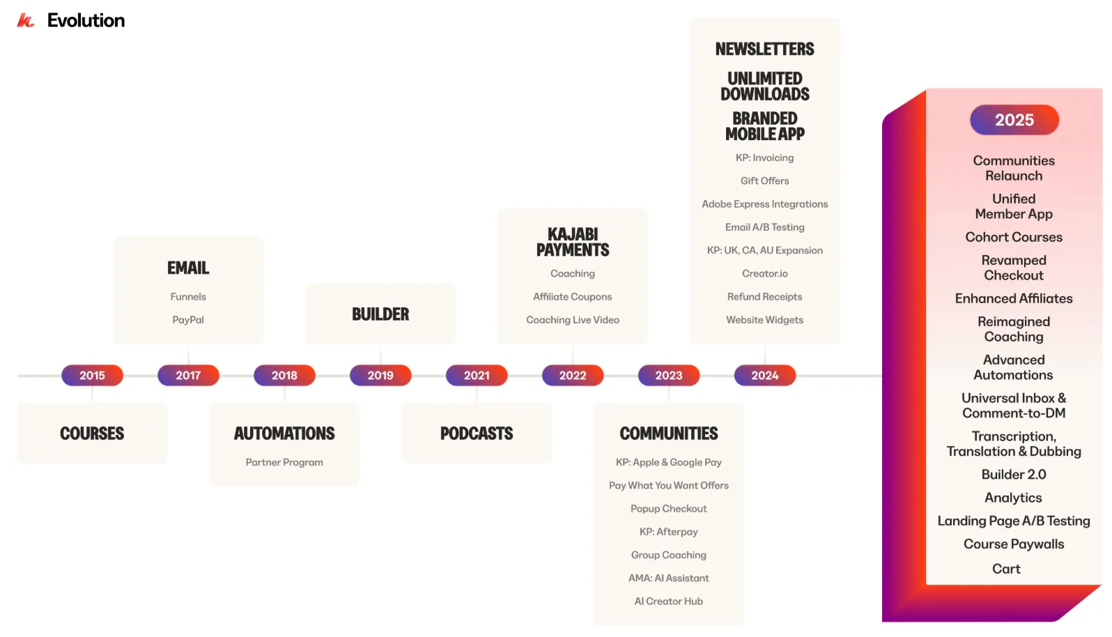 When New Kajabi launched in 2015, we were simply a course platform. No landing pages. No email. Just a way to share knowledge online. In the decade since, we’ve continued to add value, launching products and features like coaching, communities, digital downloads, newsletters, automations, payments, affiliates, branded mobile apps, and hundreds of other upgrades and improvements across the platform.